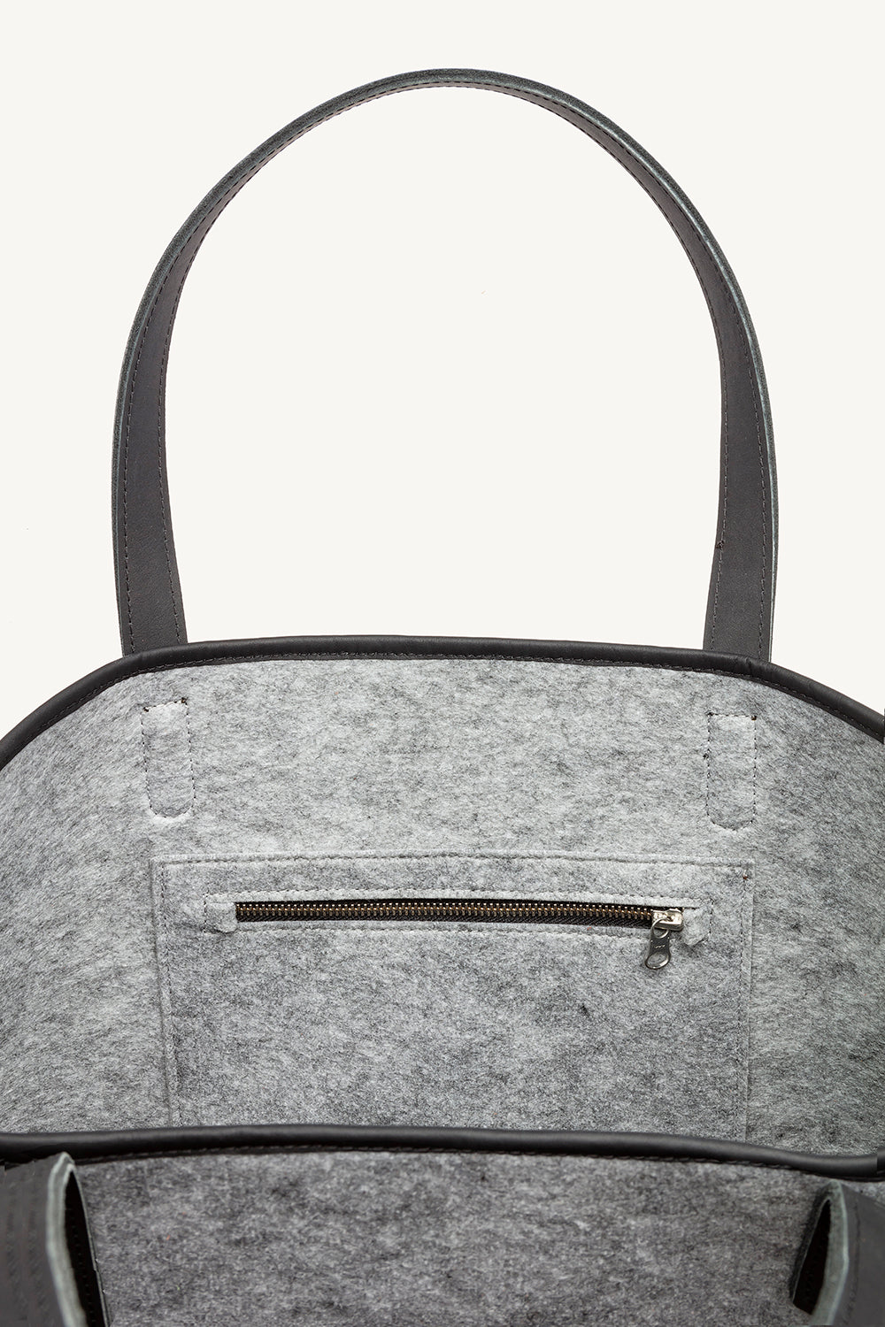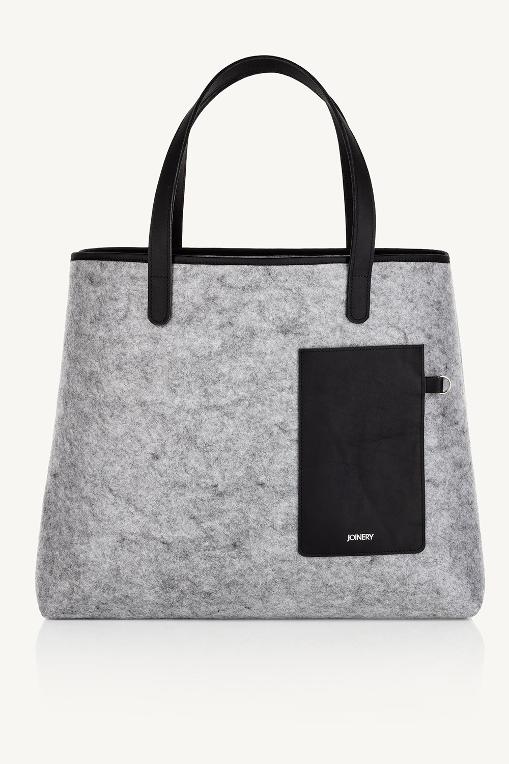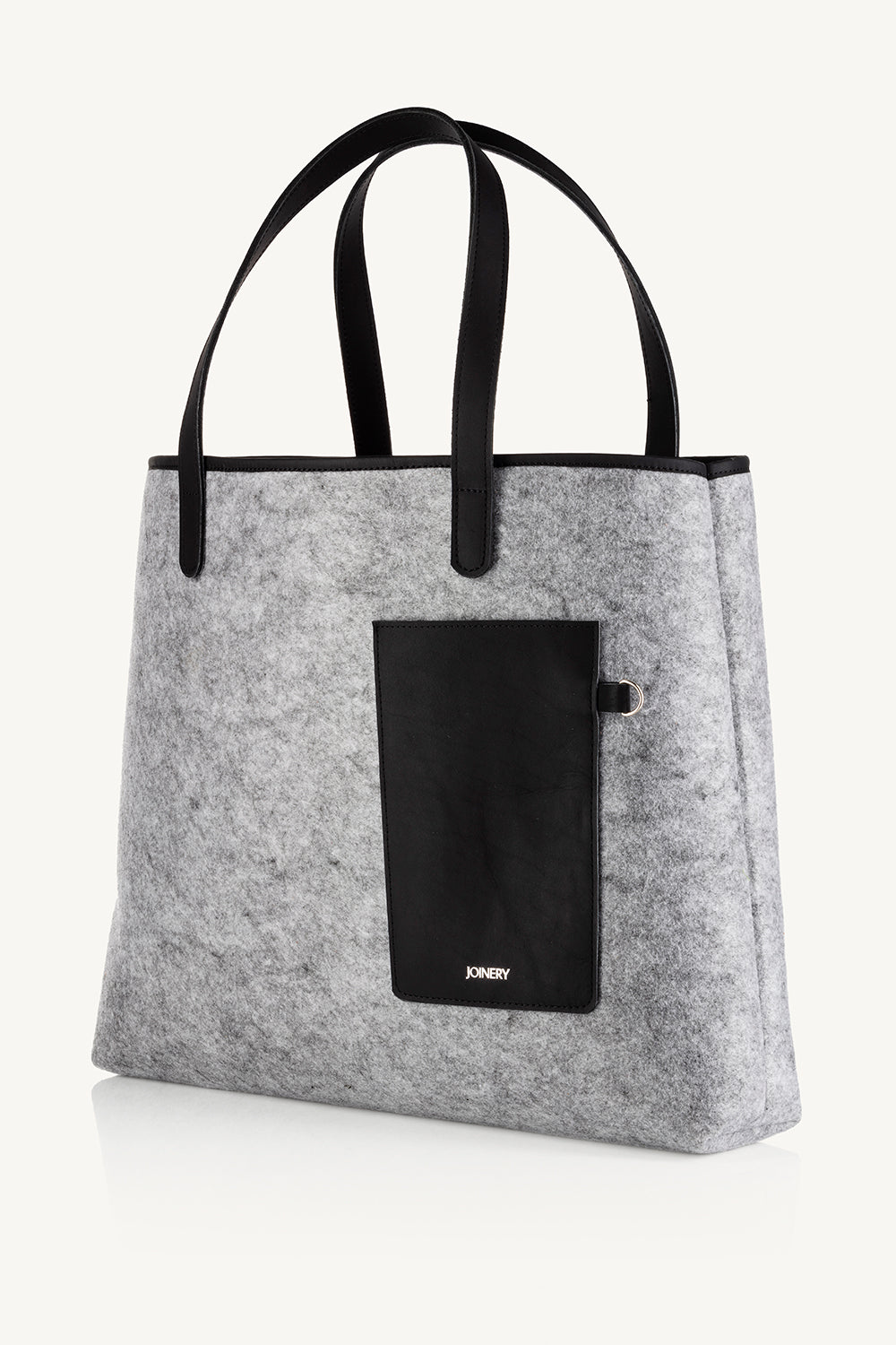 Experience the perfect blend of style and function with our XL Pocket Tote. Crafted from grey FutureFelt® and finished with black leather handles, binding, and an outside pocket for quick phone access. A D-ring secures your card holder, keys, or sunnies sleeve, while an inside zip pocket keeps valuables safe.